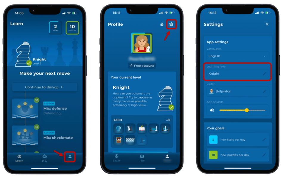 If the lessons are too hard or too easy, you can easily adjust your level. Go to your profile, then to settings and change your Learning level to the desired level.