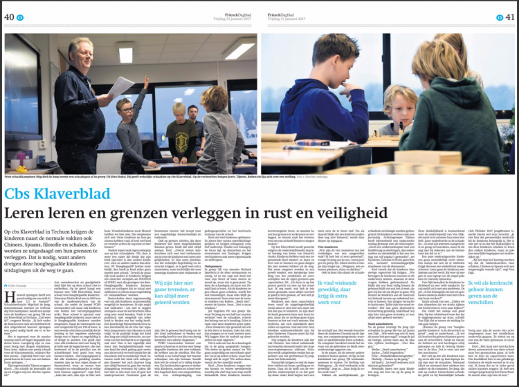 In de Onderwijsbijlage van het Fries Dagblad staat een groot artikel over CBS Het Klaverblad in het Friese Techum en de manier waarop Chessity ambassadeur Migchiel de Jong schoolschaaklessen gebruikt om kinderen uit te dagen hun grenzen te verleggen. “Ik heb onder de douche eens voor een heleboel velden uitgerekend hoeveel sprongen een paard nodig heeft om er te komen”, vertelt een van kinderen in het artikel. Mooi om te zien hoe schaken hem aan het denken zet!
